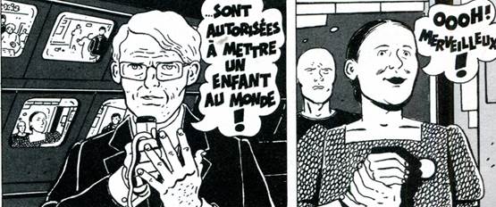 Any free society has a psychological basis. I think this is something Chantal Montellier’s Shelter was getting at (Alternates 6); demagogues with visions of order permeate her female-focused future dystopia. Their vision does not spring from the basis of the society, which is psychological. This harks back to Greek tragedy, and the basis of drama in the family. The male authoritarian figures in Shelter sweeten the ointment with demos-friendly handouts and barren types of “idealism” which don’t fool our heroine.